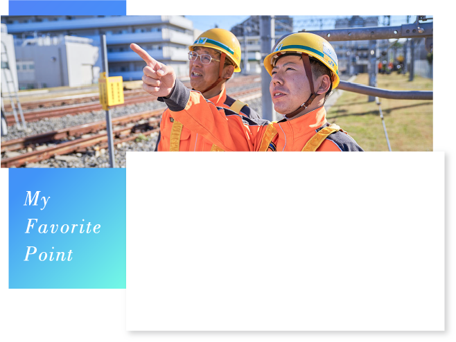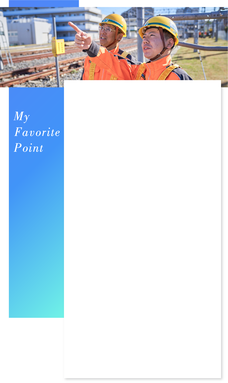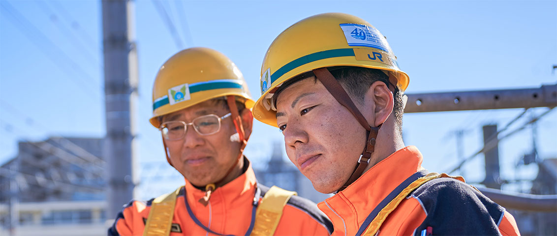 入社したばかりの頃、右も左も分からなかった私を鍛えてくださった先輩方の存在を抜きにして今の私はありません。同じJRの先輩方だけでなく共に働くグループ会社の方にも鉄道電気の知識・技術はもちろん、作業時の目配り、気配り、緊急時の対処法など、教わったことのすべてが今の私の仕事につながっています。社員研修センターの講師となり、次世代の人財育成という観点から、「先輩たちのように、今度は自分が後輩を引っ張っていかないといけない」という想いも、日々強くなっています。
