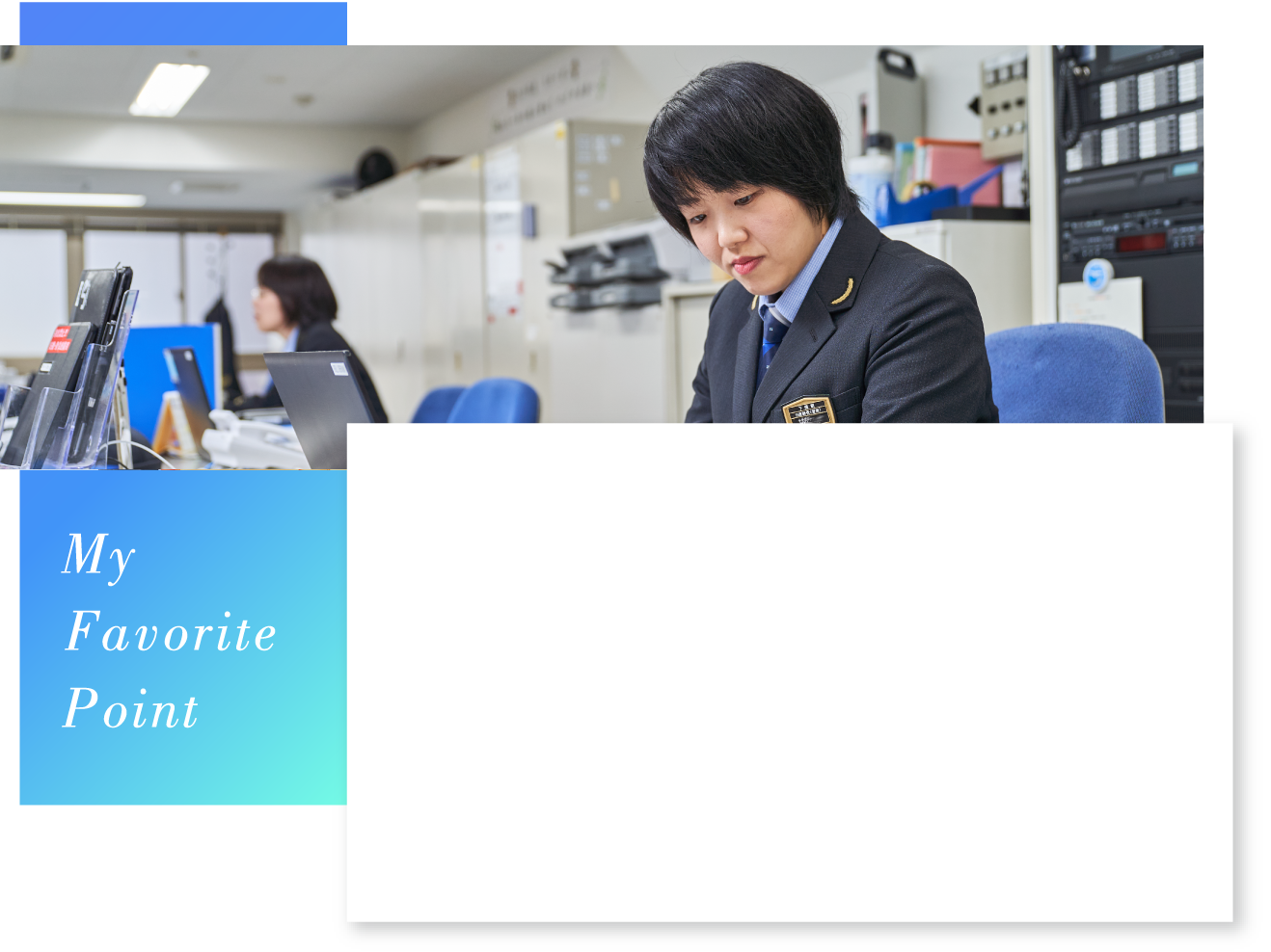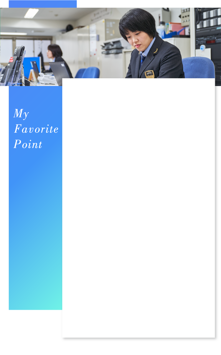 現在は下関駅の係長として当務業務を担当、主に売上と社員の管理に携わっています。下関駅も含めて8駅分の売上を管理し、締切業務終了後のお金を回収して、銀行へ入金の手配をします。社員管理業務としては、当駅を管轄する広島支社から業務に関する書面が届くので、必要に応じて社員にそれを伝えます。もちろん、日々の社員の仕事ぶりにも気をかけますし、体調不良などによる急な勤務変更の際の調整も手がけます。係長として心がけるのは、上司と一般職のスタッフのつなぎ役として機能し、そのうえで「社員を守れる係長」になるということ。特に若手社員の声を汲み取り、思いを上司にも伝えられればと思っています。また、社員一人ひとりに目を行き届かせるためには、日頃からのコミュニケーションも不可欠です。当務業務は24時間勤務の交代制となりますが、一緒に泊まり勤務をするスタッフとは直接やり取りをする機会も多くなるので、身近に接するなかで普段と変わったところがないかなどを気にかけるようにしています。現在、当務業務に携わる4人の係長のうち、女性は私一人。女性スタッフのフォローを含め、私自身が「今自分にできる精一杯のこと」に取り組むとともに、今後も社員の皆が働きやすい職場づくりに貢献していければと思います。